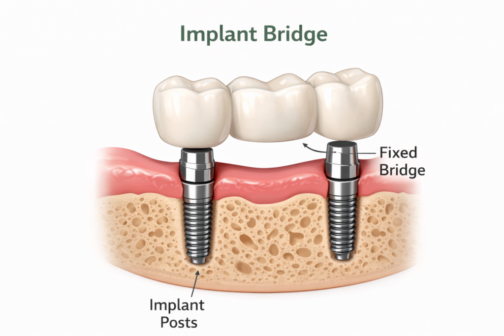When several teeth are missing in a row, implant bridges provide a stable and supportive solution. Instead of relying on surrounding teeth, this option uses implants placed directly into the jawbone.